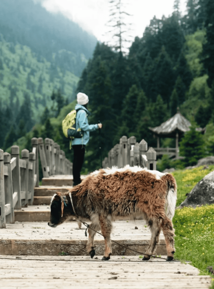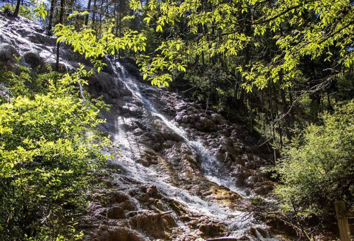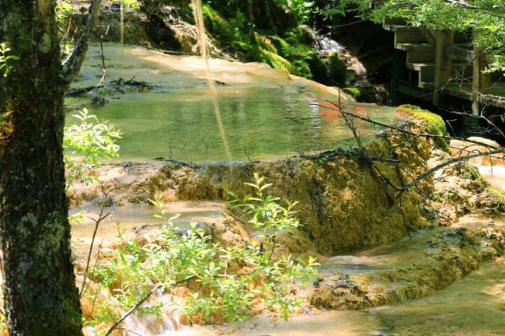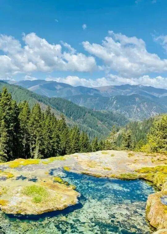 踏入卡龙沟,就像闯进童话宇宙,苔藓铺得厚厚的,融水灌满了钙华池,池水重重叠叠,水光潋滟,好意思不堪收。