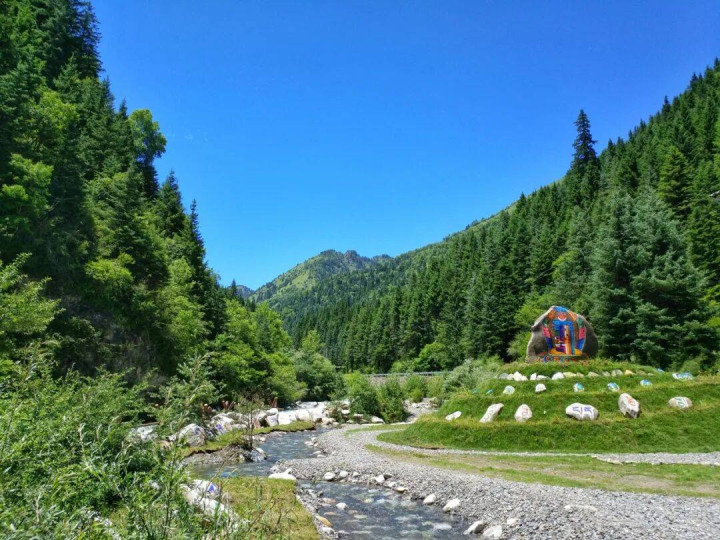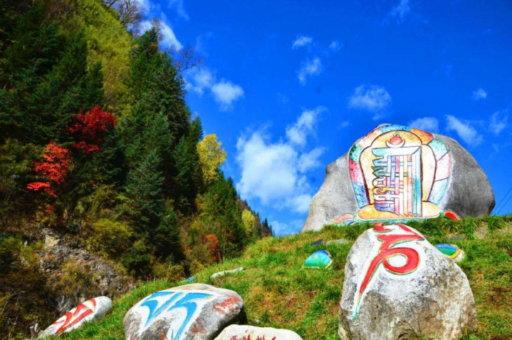 散步在奶子沟祥瑞营地的溪水河边,随地可见洒落着具有藏族文化特质的石刻作品,为这里平添了几分野趣。